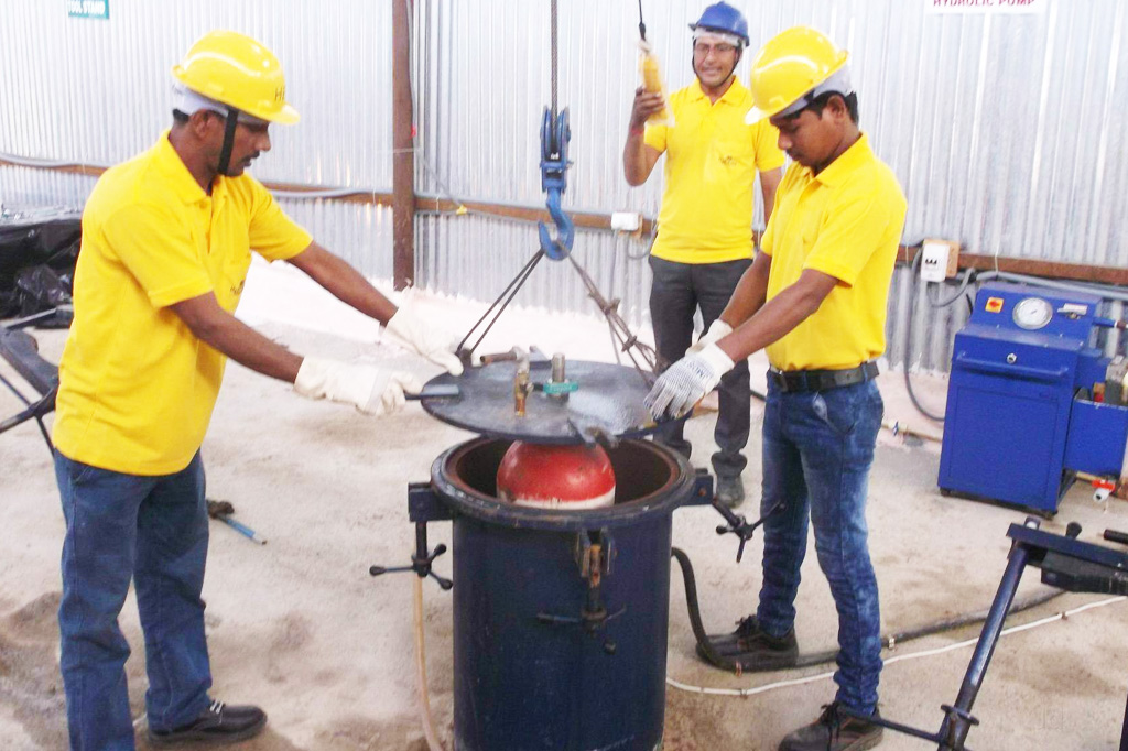 Internal cleaning of cylinders.Cylinder Wall Thickness measurement by Ultrasonic Thickness Tester.Water Jacket and Direct Expansion method for Hydrostatic stretch testing. Cylinder Drying, External Cleaning and Painting. Test mark sign is used after testing the fitness of the cylinder. De-pressuring & Degassing of Cylinders Checking of Tare Weight External Inspection (thickness,bulge,burn,dents,dig).Internal Inspection,Hydrostatic Test,Fixing of Valves, Assemble & Disassemble of CNG Cascades,Deliver the cylinder with Certificate.